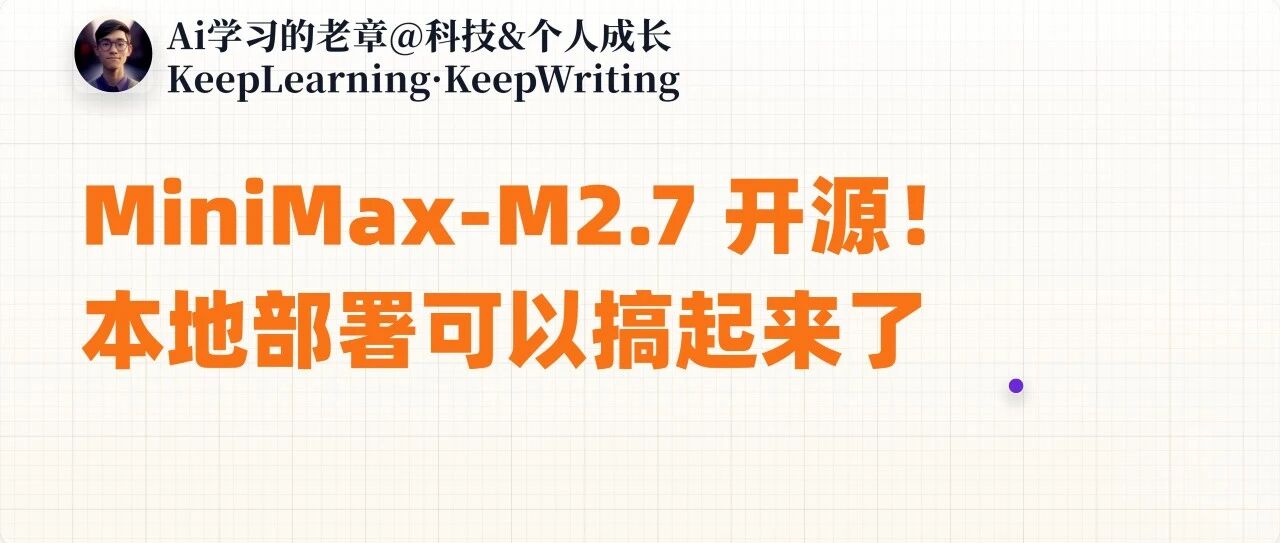 MiniMax-M2.7 开源了,本地部署指南 Ai学习的老章 · 公众号 · · 5 天前 · |