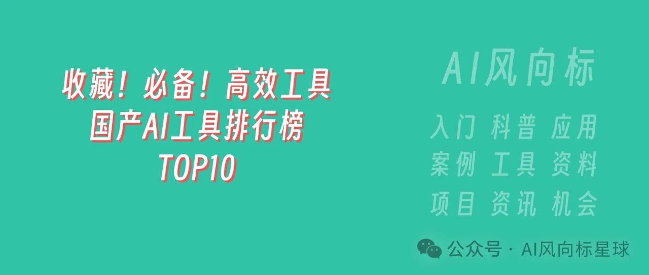 收藏必看!国产AI工具排行榜TOP10 AI风向标星球 · 公众号 · · 1 年前 · |