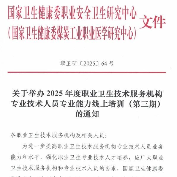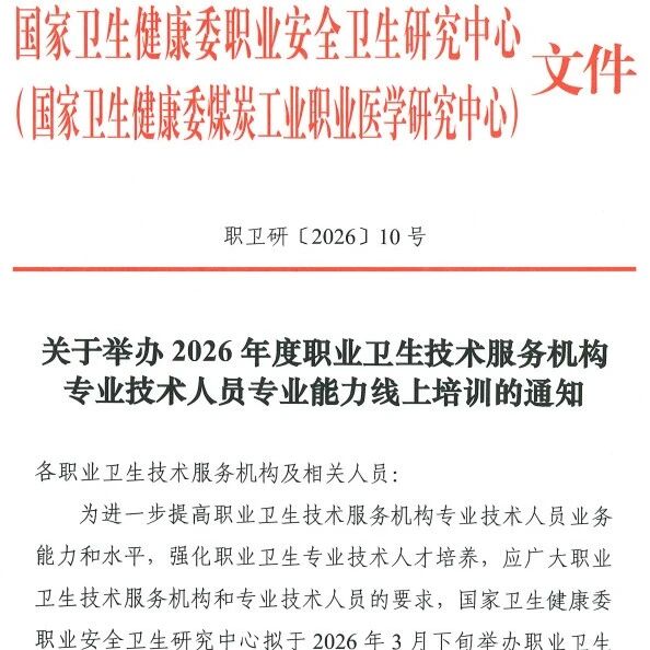 关于举办2026年度职业卫生技术服务机构专业技术人员专业能力线上培训的通知 职业卫生技术服务分会 · 公众号 · · 2 周前 · |