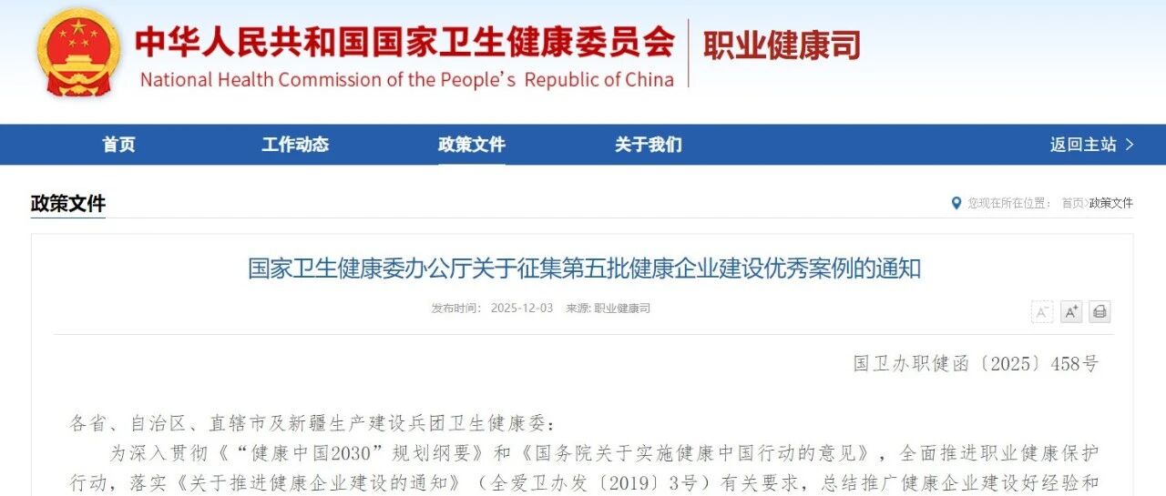 国家卫生健康委办公厅关于征集第五批健康企业建设优秀案例的通知 职业卫生技术服务分会 · 公众号 · · 2 月前 · |