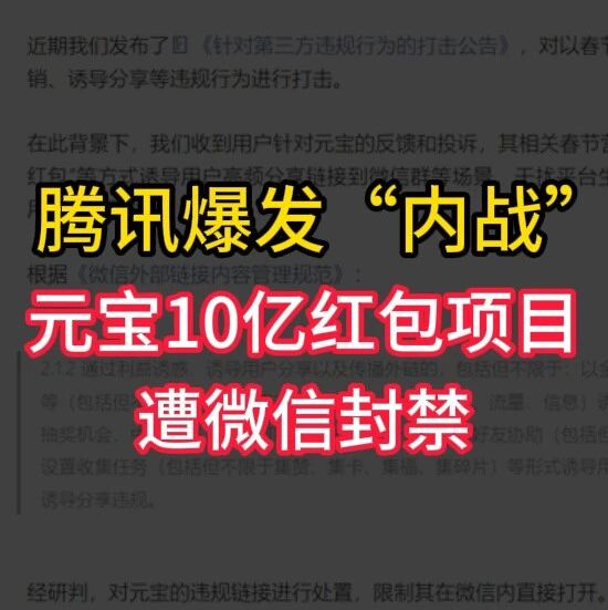 腾讯爆发“内战”:元宝10亿红包项目遭微信封禁 财圈社 · 公众号 · · 3 周前 · |