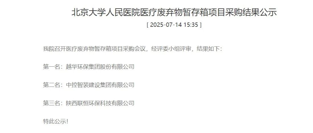 天大越华 | 越华环保斩获北京大学人民医院医疗废弃物暂存箱项目采购第一名! 越华润华环保 · 公众号 · · 4 月前 · |