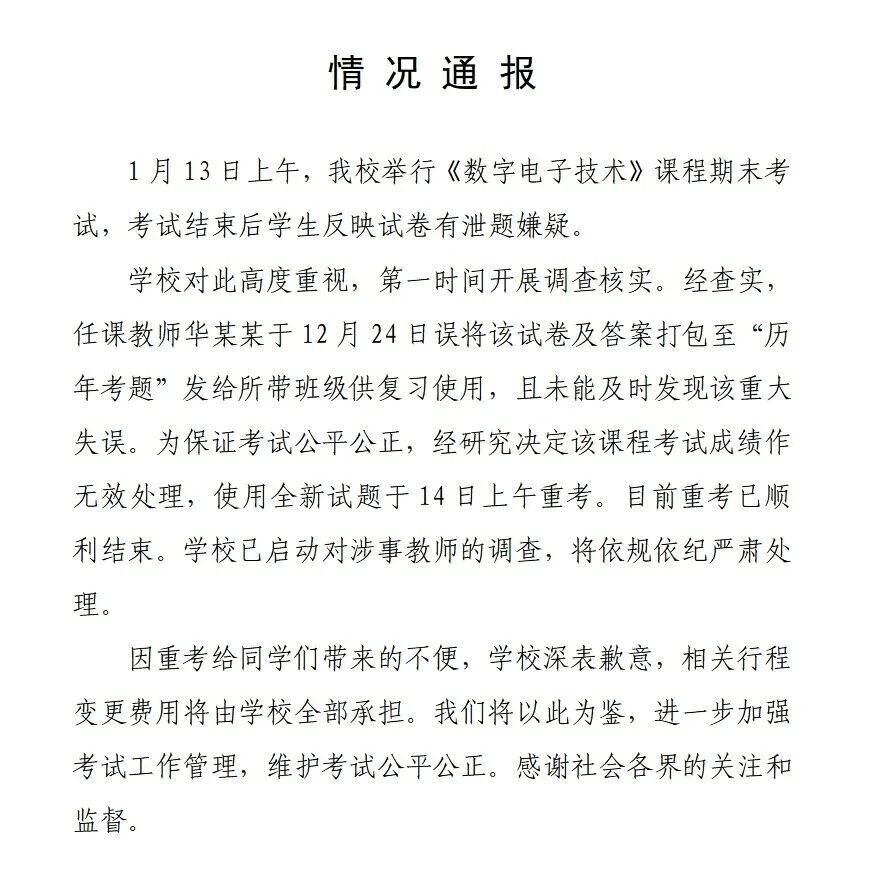 南京一大学期末考试泄题,所有学生被召回重考!官方通报 西湖之声 · 公众号 · · 15 小时前 · |