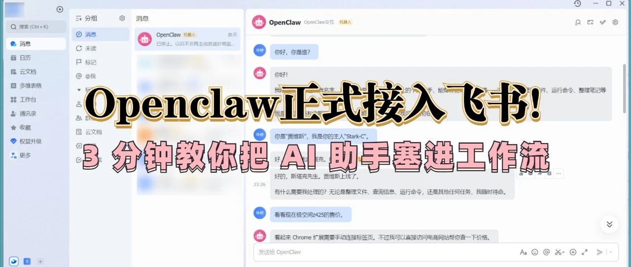 Openclaw正式接入飞书!3 分钟教你把 AI 助手塞进工作流 Stark324 · 公众号 · · 4 周前 · |