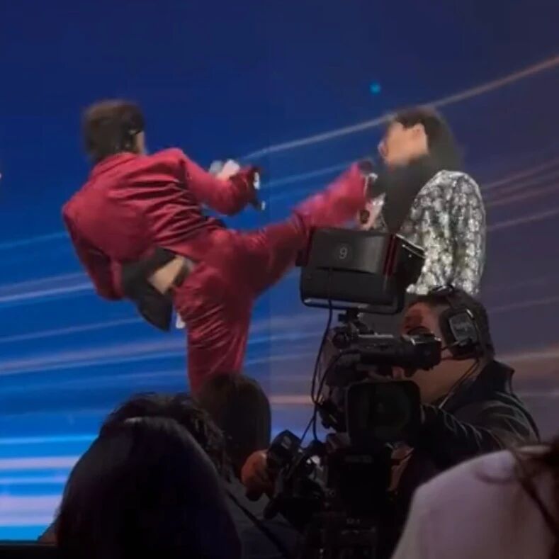 向佐突然飞起一脚,差点踢到主持人的头!主持人百克力回应“不敢还手”:确实被吓到,有0.01秒是不爽的...