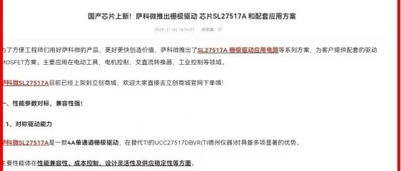 萨科微栅极驱动芯片SL27517A应用方案在立创商城正式上线!(萨科微11月25日每日芯闻) 萨科微 芯动未来 · 公众号 · · 1 周前 · |