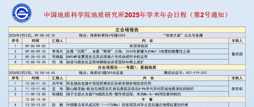 2026年2月3日:中国地质科学院地质研究所2025年度学术年会,腾讯会议 地球资源与地质活动 · 公众号 · · 4 周前 · |
